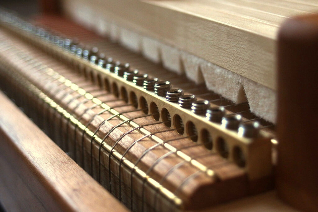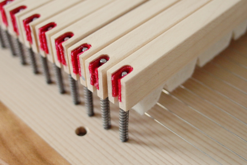 Modèle haut de gamme. La présence d’un barrage en x et l’utilisation de bois massif (épicéa du jura pour la table, érable pour le fond) lui confère une puissance sonore et une grande netteté acoustique dans les médiums et les aigus. L’utilisation de feutres de 8mm de haut rend le clavier souple pour un bon confort de jeu et sollicite moins le poignet que la plupart des instruments de série. L’usage d’un feutre de casimir au niveau de l’articulation des touches rend le clavier plus doux au toucher. Des accordeurs fins associés aux chevilles traditionnelles permettent une plus grande précision dans l’accordage de l’instrument. Le cadre en chêne massif est plaqué d’érable avec des filets d’alisier pour un beau rendu esthétique.
