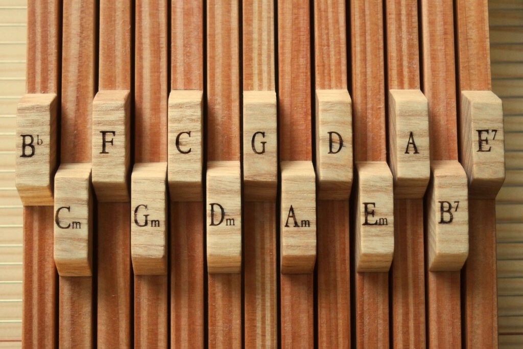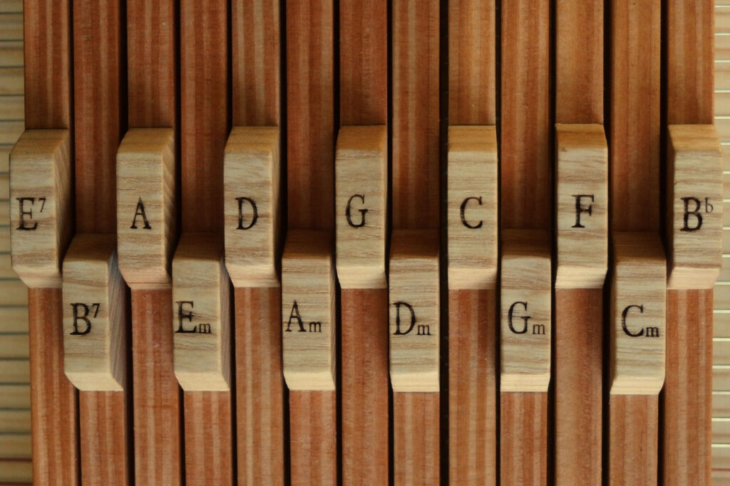 L’utilisation de feutres de 8mm de haut rend le clavier souple pour un bon confort de jeu. L’aspect esthétique est épuré avec le cadre en chêne massif apparent sur les bords de l’autoharpe